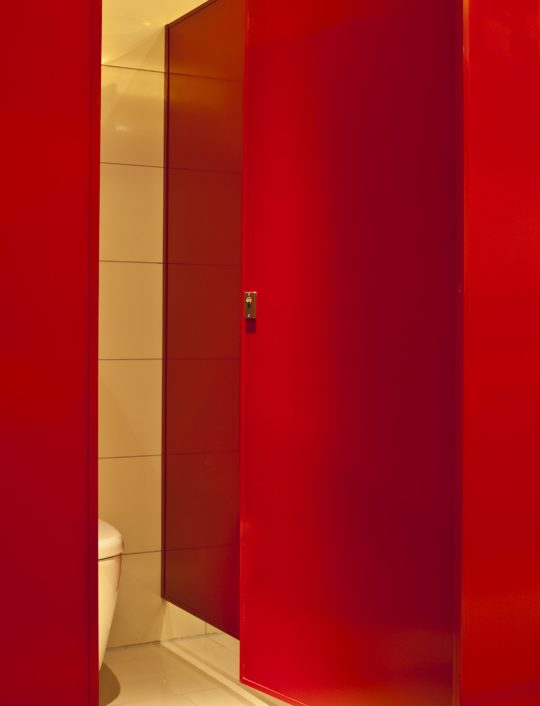 Vitraflex Vitreous Enameled steel toilet cubicles were chosen in Black (Vit 301) for the hotel building, in Signal Red (Vit 505) for the office building and in Pure White (Vit 104) for the hotel staff bathrooms. Aluminium fixing channels and top rails were supplied in powder-coated finish to match the three vitreous enamel colours chosen.