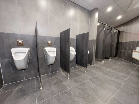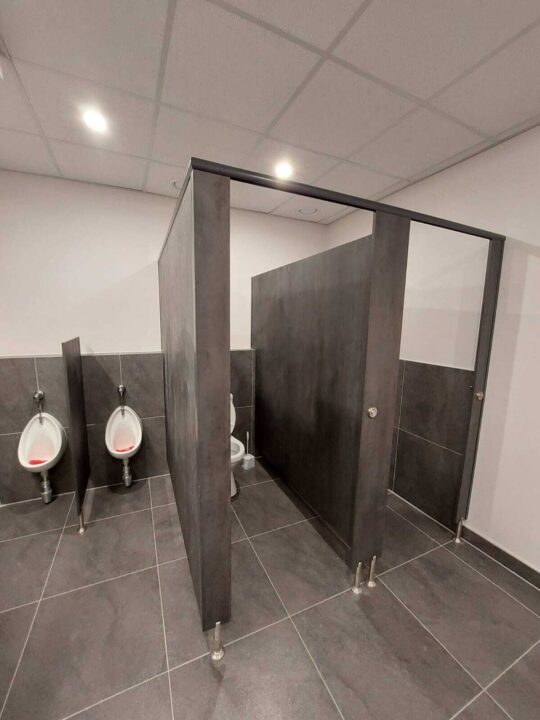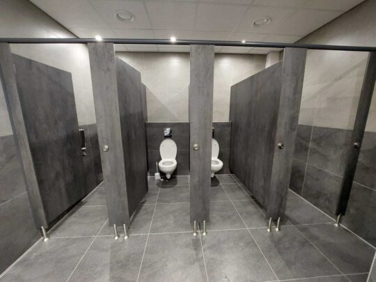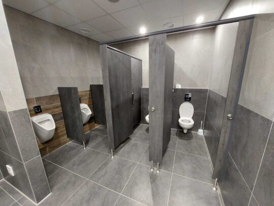 These beautiful bathrooms were designed by Axion Architects, and manufactured and installed by us, using a melamine in a special finish, combined with Grade 316 stainless steel ironmongery (including Rise and Fall hinges) and pedestals. The panels are frameless, and installed with continuous aluminium fixing channels. For this application our Oval Aluminium Top Rail was selected, but these cubicles can also be supplied with the stainless steel headrail and hanging clamp option. Architects- Axion, Main Contractor- Isipani Construction.