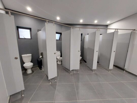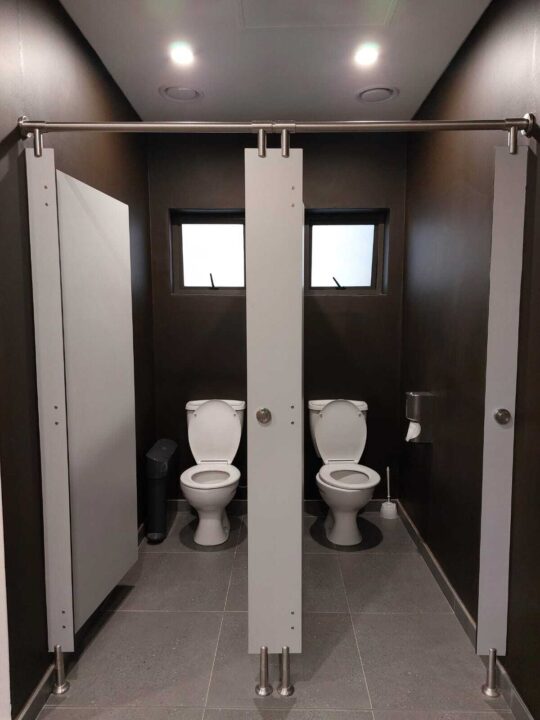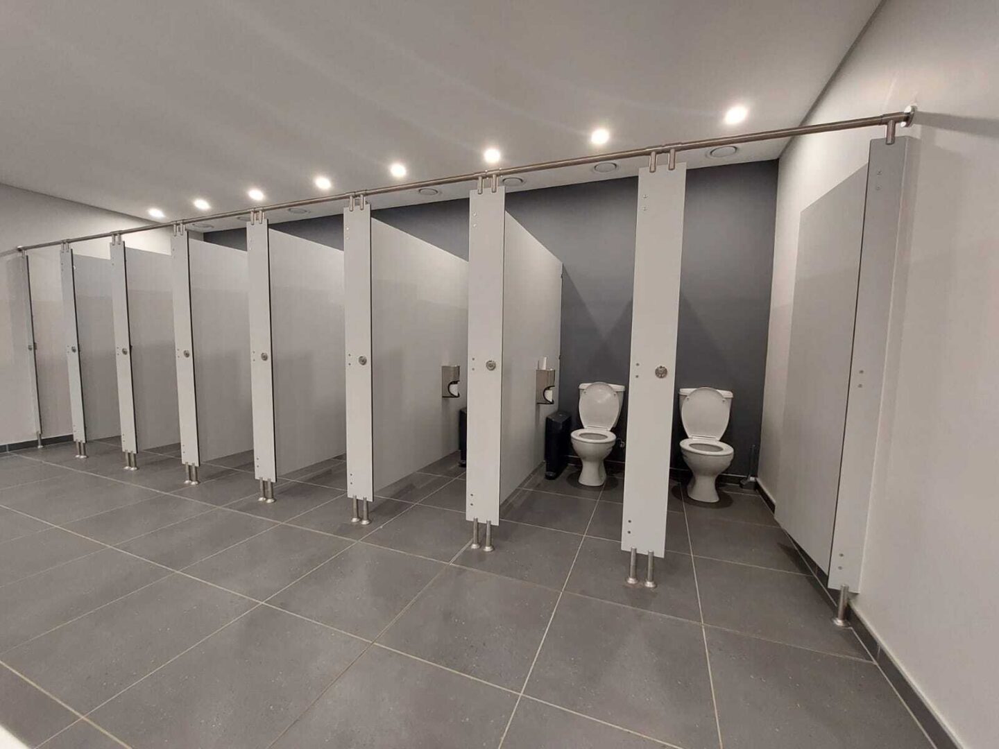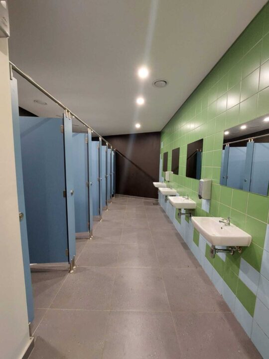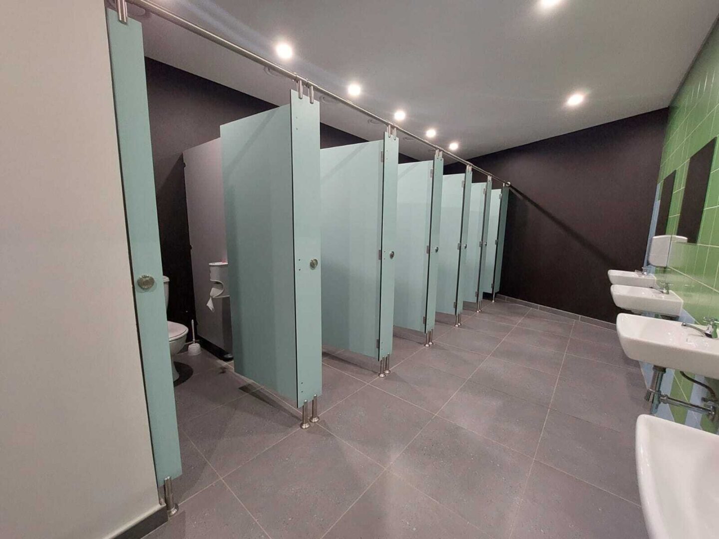 Beautiful bright and bold colours were specified by BPAS Architects for the Facade Frameless Compact toilet cubicles in the children's bathrooms, to compliment the exciting tile and wall colour combinations. Four colours were chosen for the stiles, doors and urinal screens, whilst in the staff and visitors ablutions, soft grey cubicles were specified to compliment the charcoal walls. Grade 316 stainless steel ironmongery, leg supports and hanging clamps are standard to Facade Compact Cubicles, whether Compact High-pressure Laminate or Compact Density Laminate is specified for the panels.