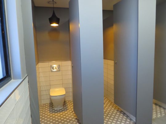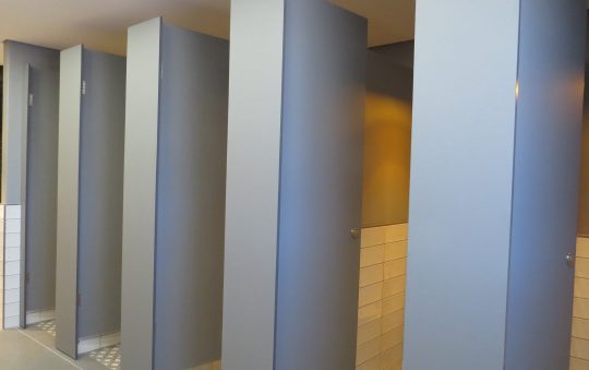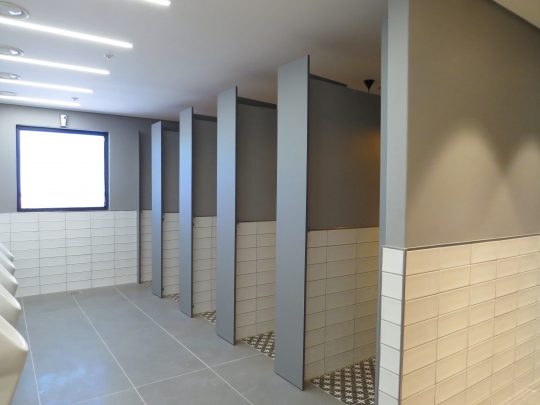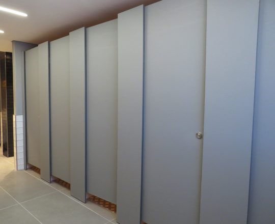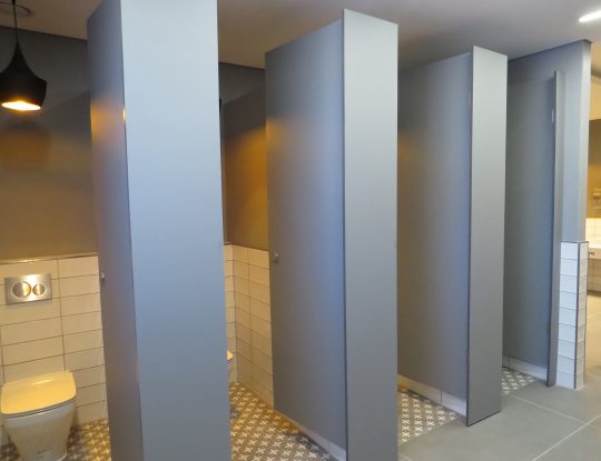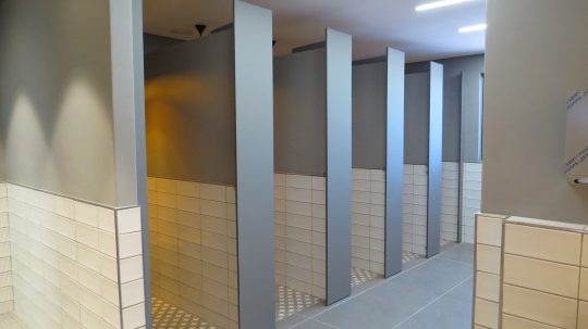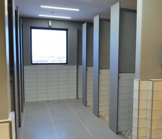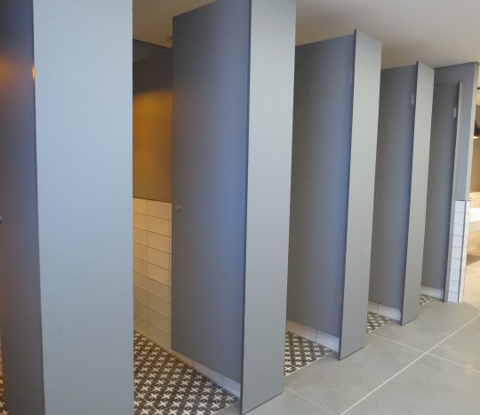 The architects who designed these magnificent bathrooms, specified Facade Linear Frameless Cubicles with Fenix NTM, which has anti-fingerprint characteristics. The components were fixed to brick walls with purpose made stainless steel brackets and raised 10mm above finished floor level. The doors were hung with stainless steel falling hinges and fitted with stainless steel indicator bolts and keeps. Thanks to the secure fixing to brickwork, no top rails were required, giving the cubicles a clean and uncluttered look. Architects - SLTA. Main Contractor - Isipani Construction.