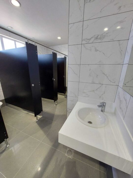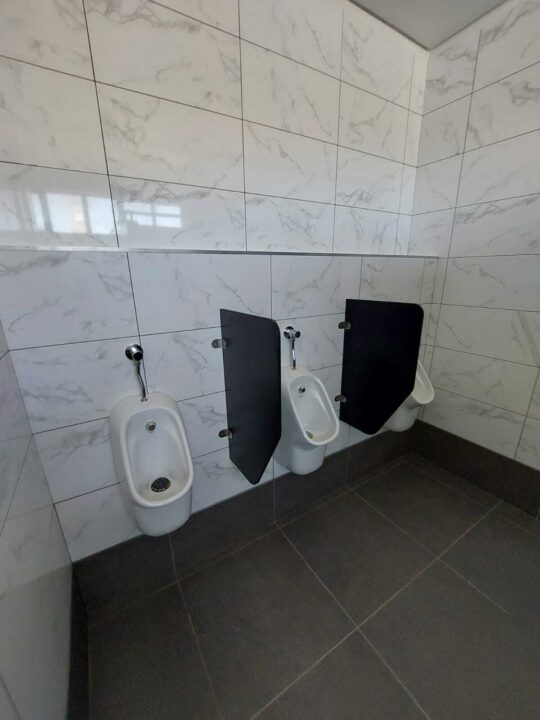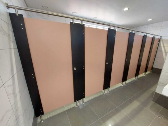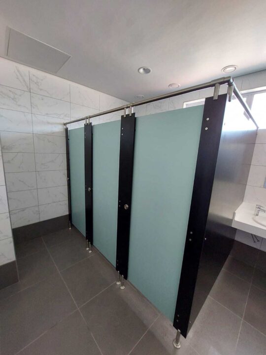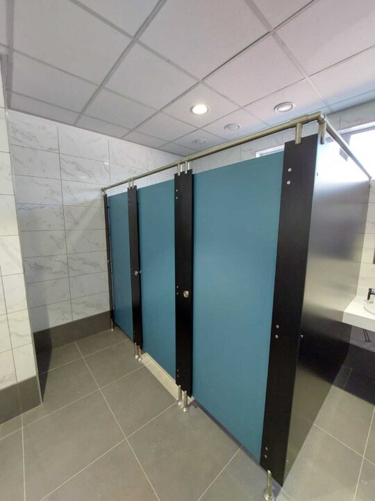 For this project, ACG Architects selected 4 special colours from our Top-of-the-Range compact high-pressure laminate; partitions , stiles and urinal screens in Designer Black, with the doors of the four bathrooms in Pink, Purple, Spearmint and Coral respectively. All ironmongery, (including rise and fall hinges) hanging clamps and pedestals were supplied in Grade 316 stainless steel.