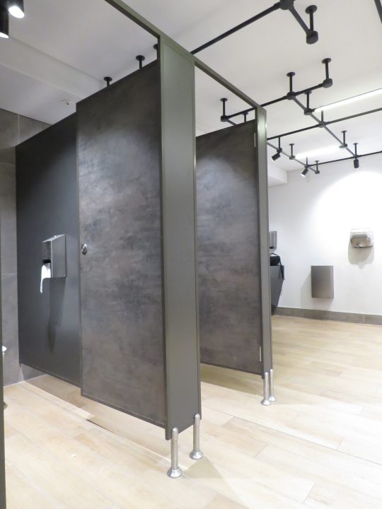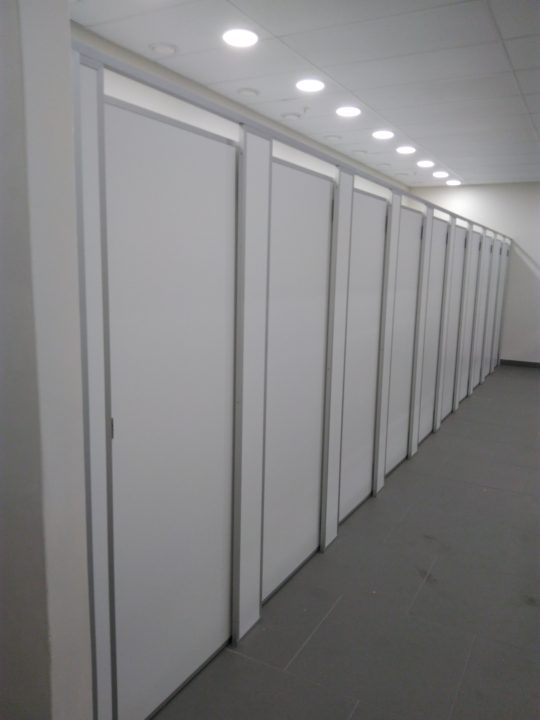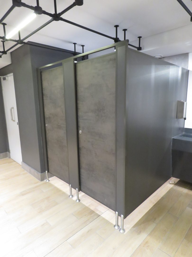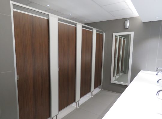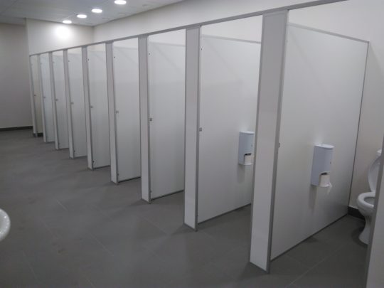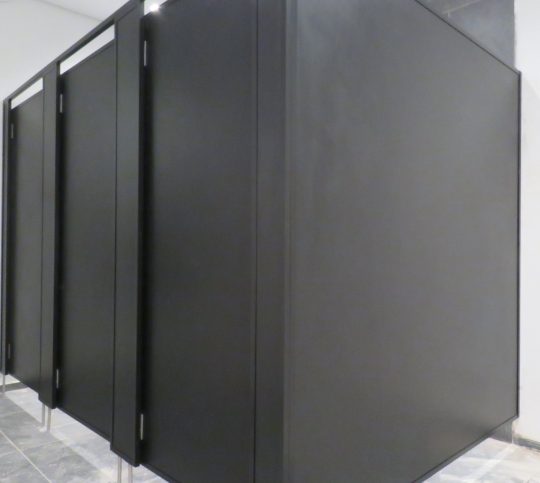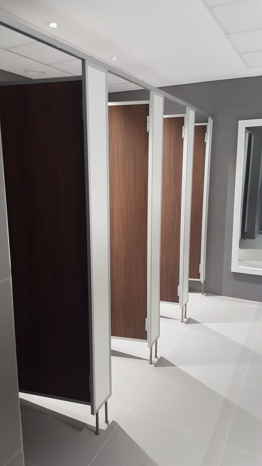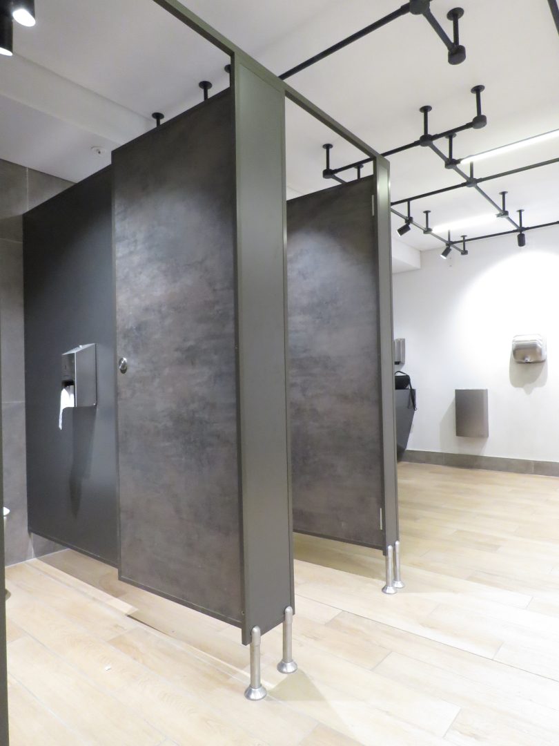 These cubicles are fixed with continuous aluminium channels and supported 150 mm above finished floor level on purpose designed conceal-fixed stile anchors, to facilitate easy cleaning. The system is finished off with quality stainless steel ironmongery, which includes rise and fall hinges as standard. Alternative ironmongery is available on request.